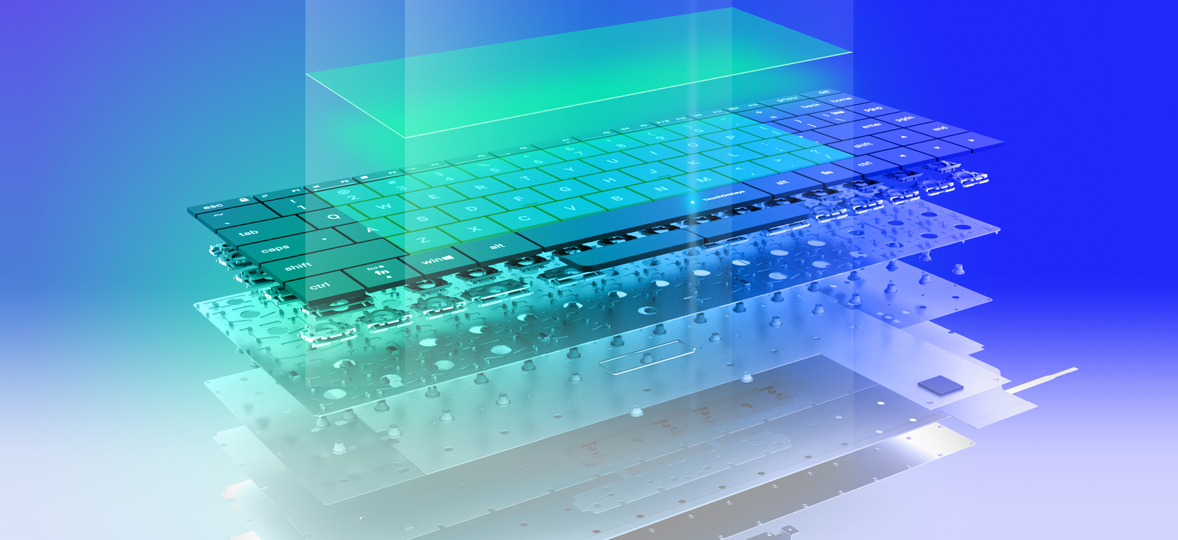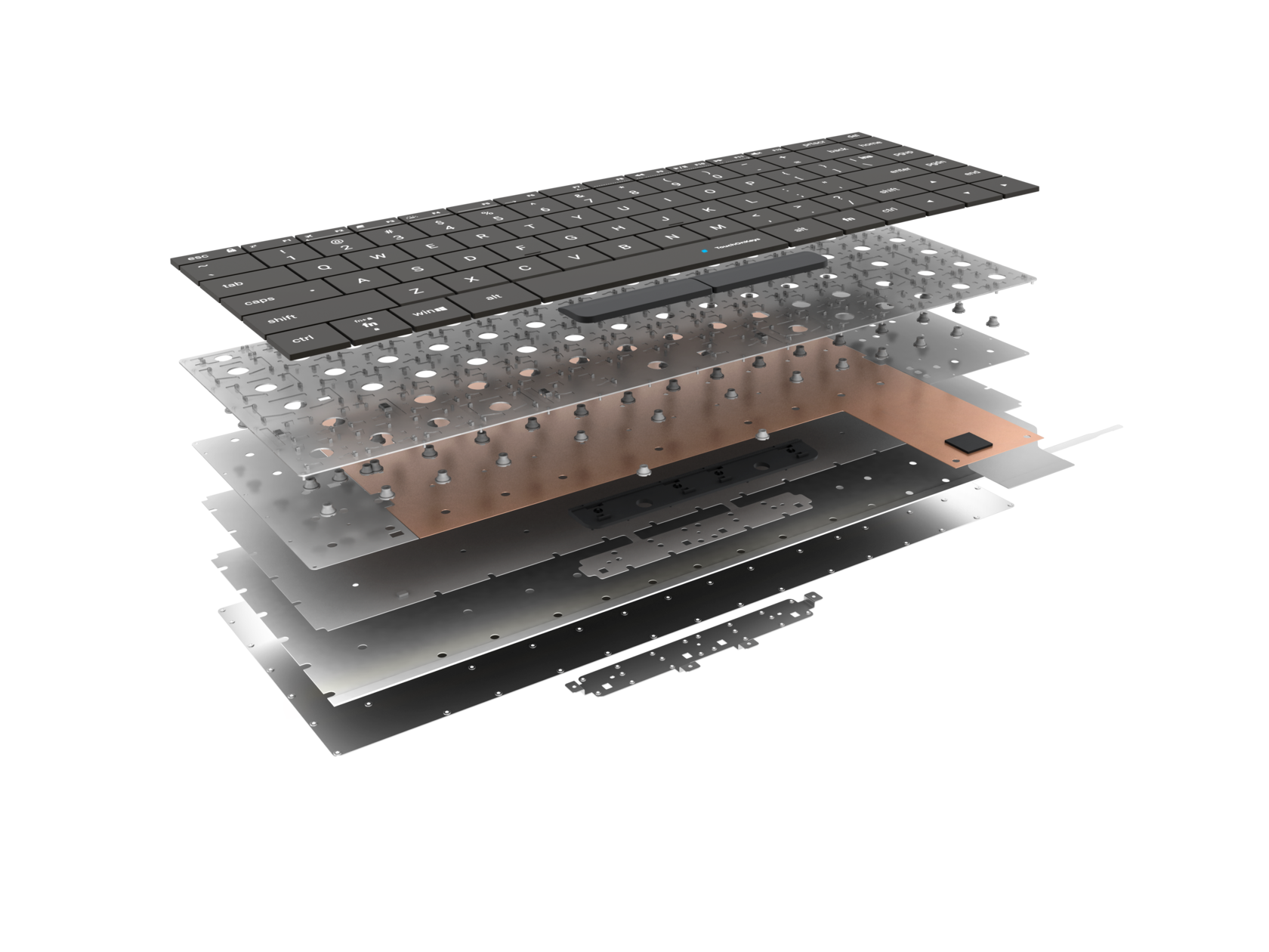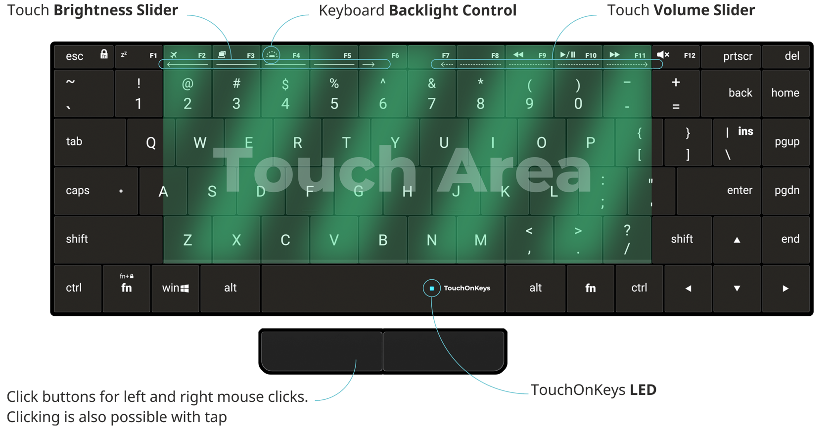 • Excellent touch function • Scissors with 1.2mm stroke • Adjustable backlight • Automated keyboard and touch switching • PTP/mouse/keyboard interfaces • Click buttons (optional) • ANSI/ISO/JIS for three different keyboard width options